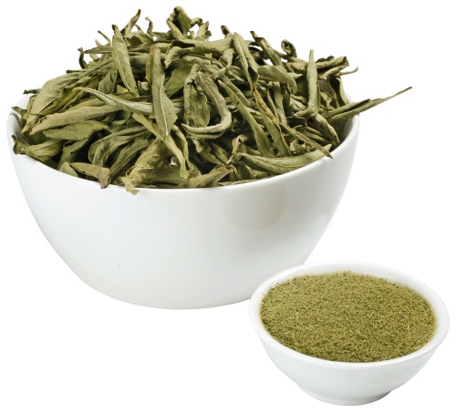 Bladen är i princip bara torkade och malda till ett pulver som är 30-40 gånger så sött som socker. Där ingår alla ämnen i bladen och det är sannolikt den mest hälsosamma formen och mest lik så som steviaväxten länge använts av urinnevånare i Paraguay.
